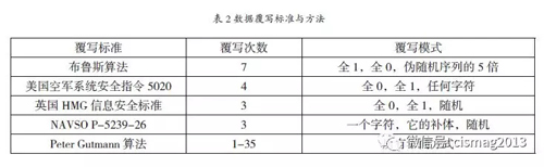 现有的数据删除技术主要包含两种:安全覆写方法和密码学删除方法。安全覆写方法是一种物理删除数据的方法,它对数据进行删除操作时首先需要对数据进行破坏,然后使用新的数据在原有数据的位置上进行覆写,从而使得用户数据无法恢复,进而实现可靠的数据删除;具体标准与算法要求如表2 所示。