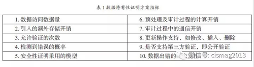 完整性审计主要包含两种审计机制:可证明数据持有(Provable Data Possession,PDP)和可证明数据可恢复(Proof of Retrievability,PoR),其对应的网络模型如图1 所示。这两个方案都是基于审计方(包括数据拥有者)与云服务器通过挑战- 响应协议来验证数据的准确性或可恢复性。区别在于,PDP 在效率方面有巨大优势,在判断云中数据是否损坏上更加快速。而PoR 机制对所存储的数据进行了预先编码处理。因此,PoR 方案不仅能验证数据是否被损坏,并且能在数据受到一定损坏时恢复数据。随着学术研究的发展,PDP 和PoR 这两个方向的研究也在高效性、动态数据支持方面不断完善。通常,考核数据持有性证明方案优劣的指标如表1 所示。